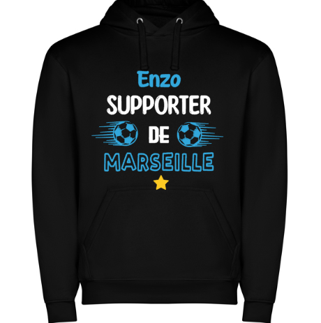 Sweat capuche noir personnalisé supporter de marseille adultes et enfants