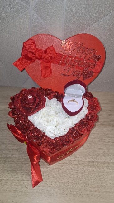 Boite en forme de coeur rouge avec rose pailleté artificielle