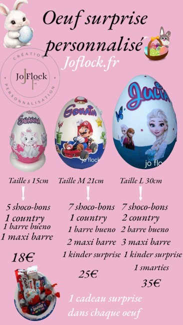 Taille L : 2 country, 3 maxi barres, 2 barre bueno , 1 kinder surprise, 7 chocobons, 2 smarties